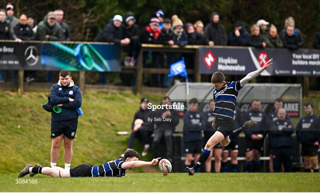 23 March 2025; Richie Waters of Wexford Wanderers kicks a penalty during the Bank of Ireland Provincial Towns Cup Round 3 match between Wicklow RFC and Wexford Wanderers RFC at Ashtown Lane in Wicklow. Photo by Seb Daly/Sportsfile
