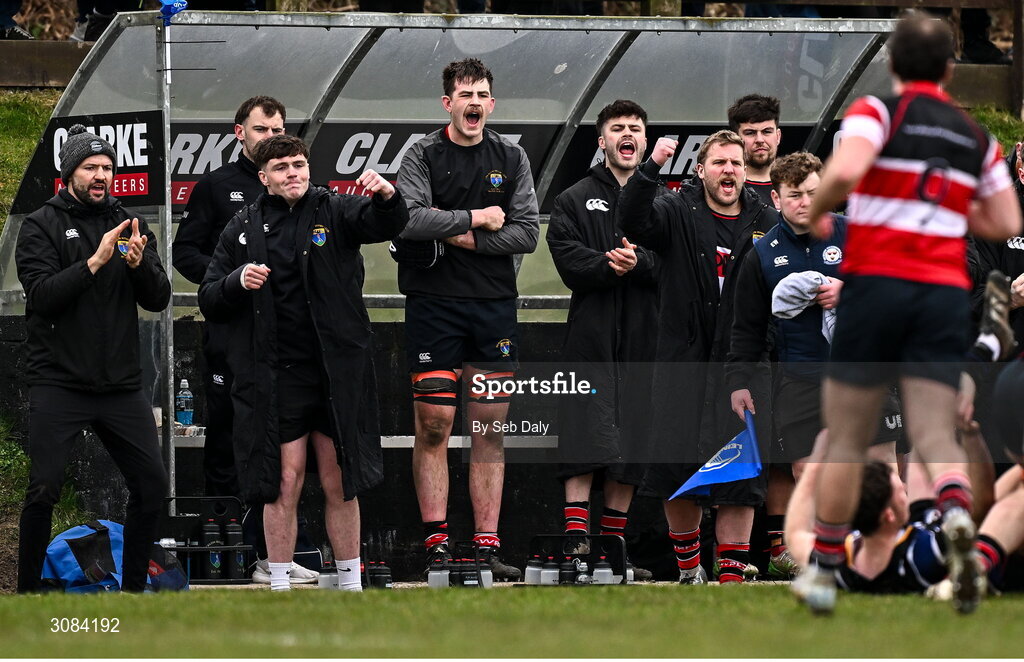 23 March 2025; Wicklow replacements celebrate during the Bank of Ireland Provincial Towns Cup Round 3 match between Wicklow RFC and Wexford Wanderers RFC at Ashtown Lane in Wicklow. Photo by Seb Daly/Sportsfile