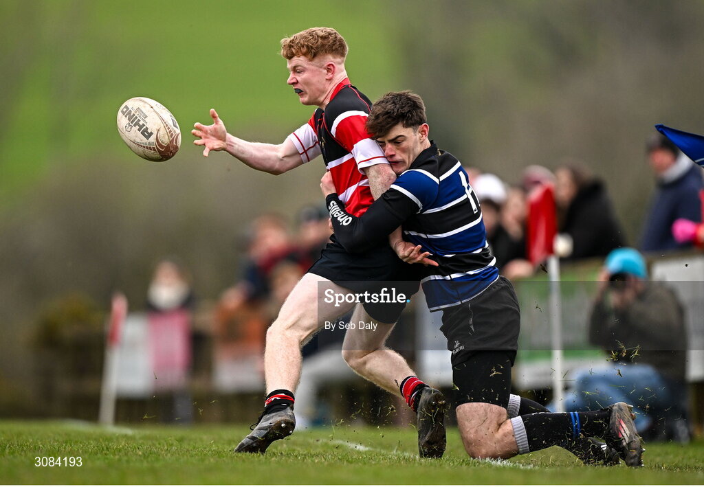23 March 2025; Josh Watson of Wicklow is tackled by Sean Logue of Wexford Wanderers during the Bank of Ireland Provincial Towns Cup Round 3 match between Wicklow RFC and Wexford Wanderers RFC at Ashtown Lane in Wicklow. Photo by Seb Daly/Sportsfile