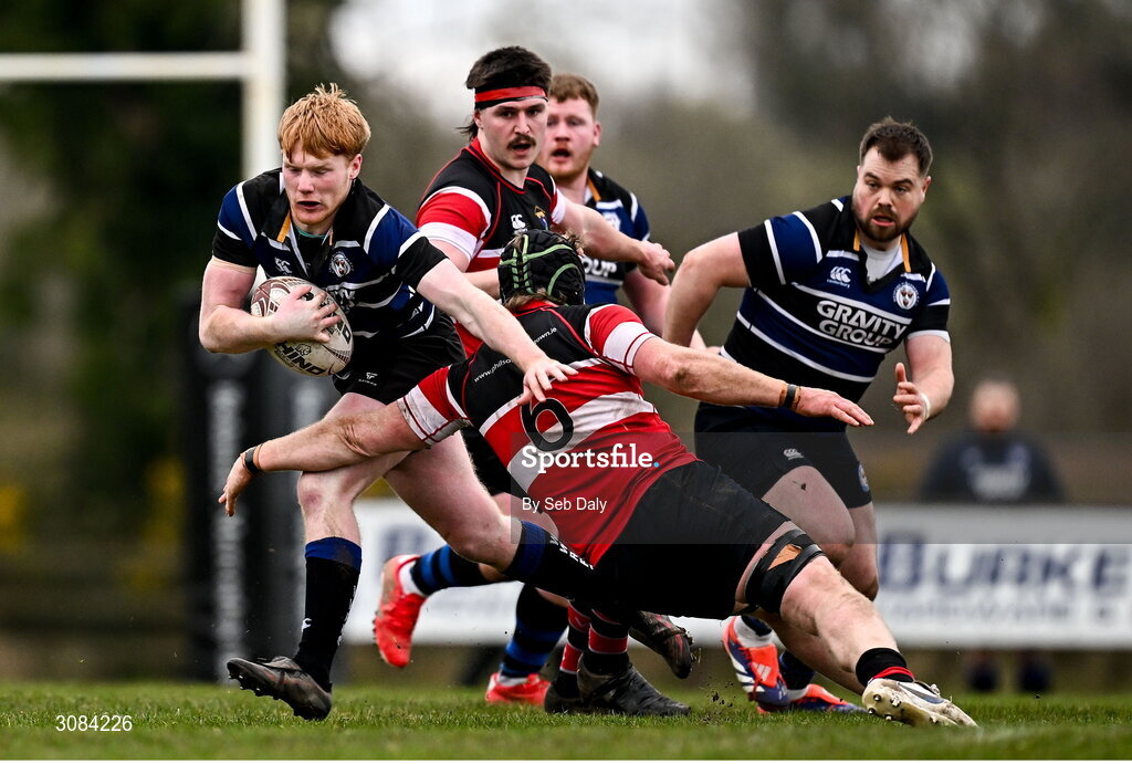 23 March 2025; Shane McGuinness of Wexford Wanderers is tackled by Liam Gaffney of Wicklow during the Bank of Ireland Provincial Towns Cup Round 3 match between Wicklow RFC and Wexford Wanderers RFC at Ashtown Lane in Wicklow. Photo by Seb Daly/Sportsfile