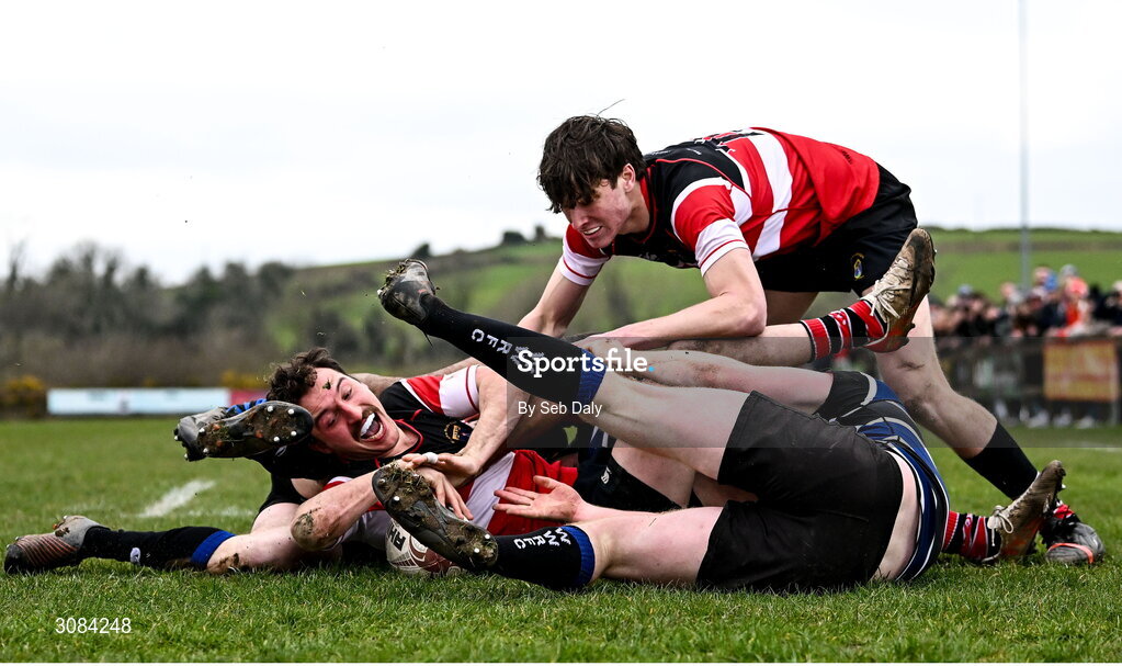 23 March 2025; Paddy McKenzie of Wicklow, left, scores his side's first try during the Bank of Ireland Provincial Towns Cup Round 3 match between Wicklow RFC and Wexford Wanderers RFC at Ashtown Lane in Wicklow. Photo by Seb Daly/Sportsfile