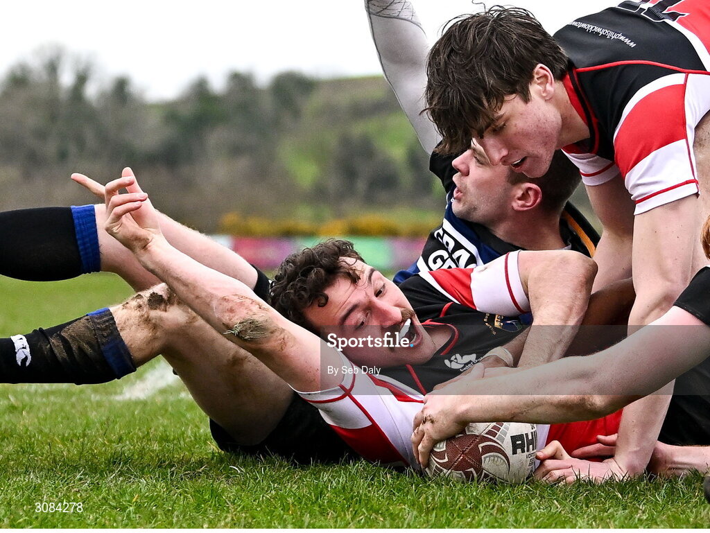 23 March 2025; Paddy McKenzie of Wicklow reacts after scoring his side's first try during the Bank of Ireland Provincial Towns Cup Round 3 match between Wicklow RFC and Wexford Wanderers RFC at Ashtown Lane in Wicklow. Photo by Seb Daly/Sportsfile