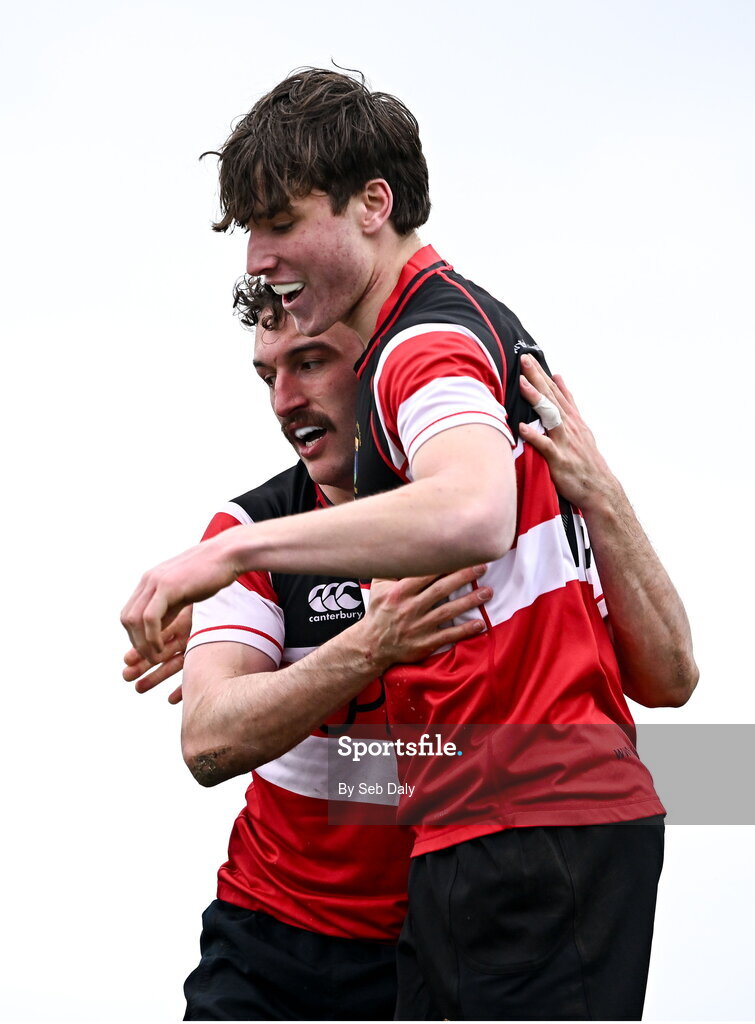 23 March 2025; Paddy McKenzie of Wicklow, left, celebrates with teammate Brian Johnston after scoring their side's first try during the Bank of Ireland Provincial Towns Cup Round 3 match between Wicklow RFC and Wexford Wanderers RFC at Ashtown Lane in Wicklow. Photo by Seb Daly/Sportsfile