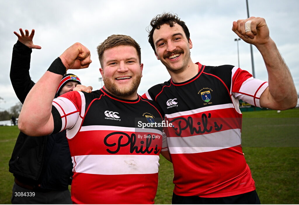 23 March 2025; Wicklow players Shane Farrar, left, and Paddy McKenzie celebrate after their side's victory in the Bank of Ireland Provincial Towns Cup Round 3 match between Wicklow RFC and Wexford Wanderers RFC at Ashtown Lane in Wicklow. Photo by Seb Daly/Sportsfile