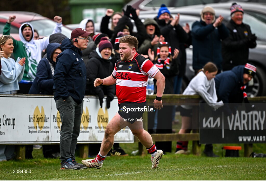23 March 2025; Shane Farrar of Wicklow after scoring his side's second try during the Bank of Ireland Provincial Towns Cup Round 3 match between Wicklow RFC and Wexford Wanderers RFC at Ashtown Lane in Wicklow. Photo by Seb Daly/Sportsfile