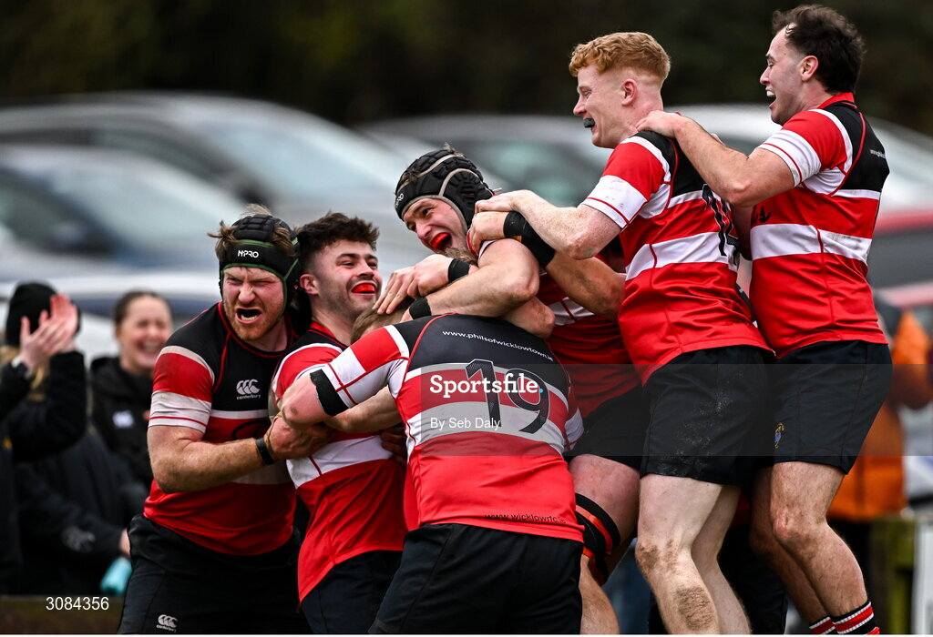 23 March 2025; Shane Farrar of Wicklow, hidden, celebrates with teammates after scoring their side's second try during the Bank of Ireland Provincial Towns Cup Round 3 match between Wicklow RFC and Wexford Wanderers RFC at Ashtown Lane in Wicklow. Photo by Seb Daly/Sportsfile