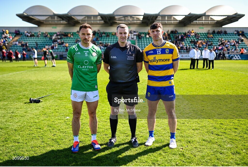 5 April 2025; Referee Thomas Murphy with team captains Eoin Walsh of London, left, and Diarmuid Murtagh of Roscommon before the Connacht GAA Football Senior Championship quarter-final match between London and Roscommon at McGovern Park in Ruislip, England. Photo by Ben McShane/Sportsfile