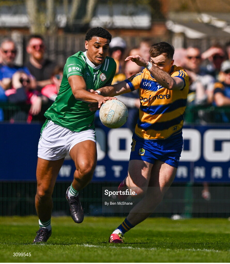 5 April 2025; Joshua Obahor of London in action against Ultan Harney of Roscommon during the Connacht GAA Football Senior Championship quarter-final match between London and Roscommon at McGovern Park in Ruislip, England. Photo by Ben McShane/Sportsfile