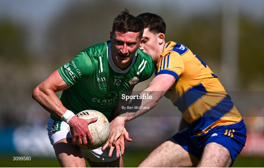 5 April 2025; Kristian Healy of London in action against Ruaidhrí Fallon of Roscommon during the Connacht GAA Football Senior Championship quarter-final match between London and Roscommon at McGovern Park in Ruislip, England. Photo by Ben McShane/Sportsfile