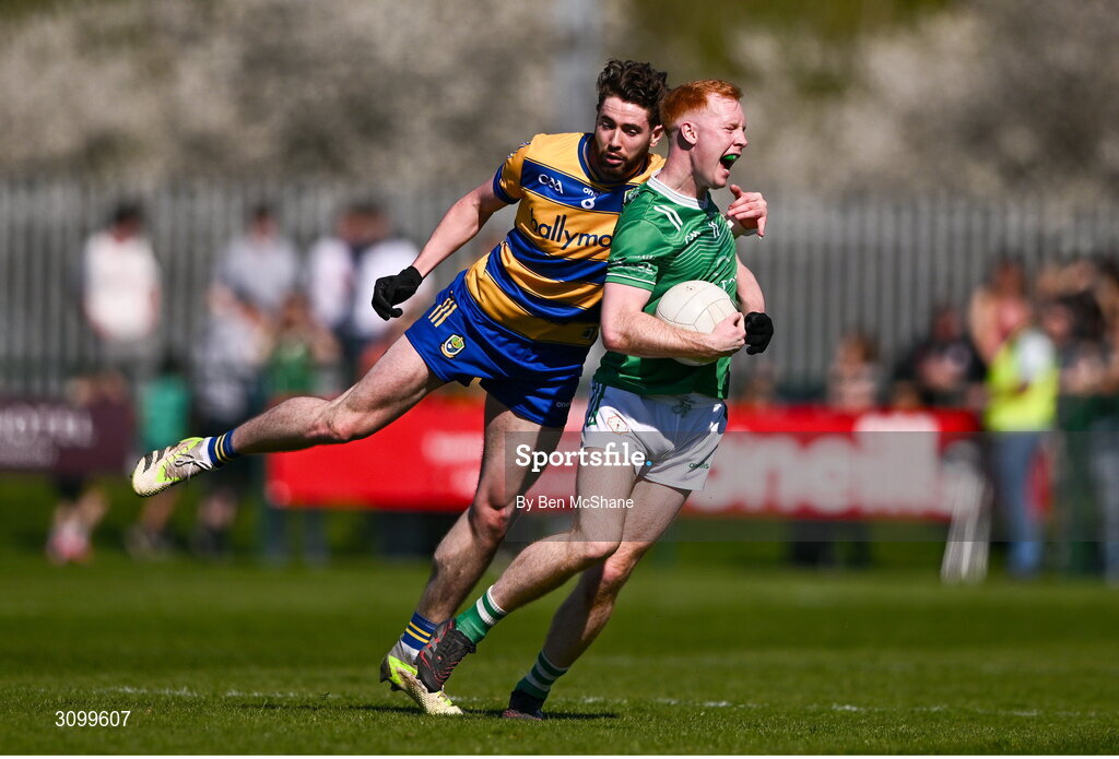 5 April 2025; Daniel Clarke of London is tackled by Eddie Nolan of Roscommon during the Connacht GAA Football Senior Championship quarter-final match between London and Roscommon at McGovern Park in Ruislip, England. Photo by Ben McShane/Sportsfile