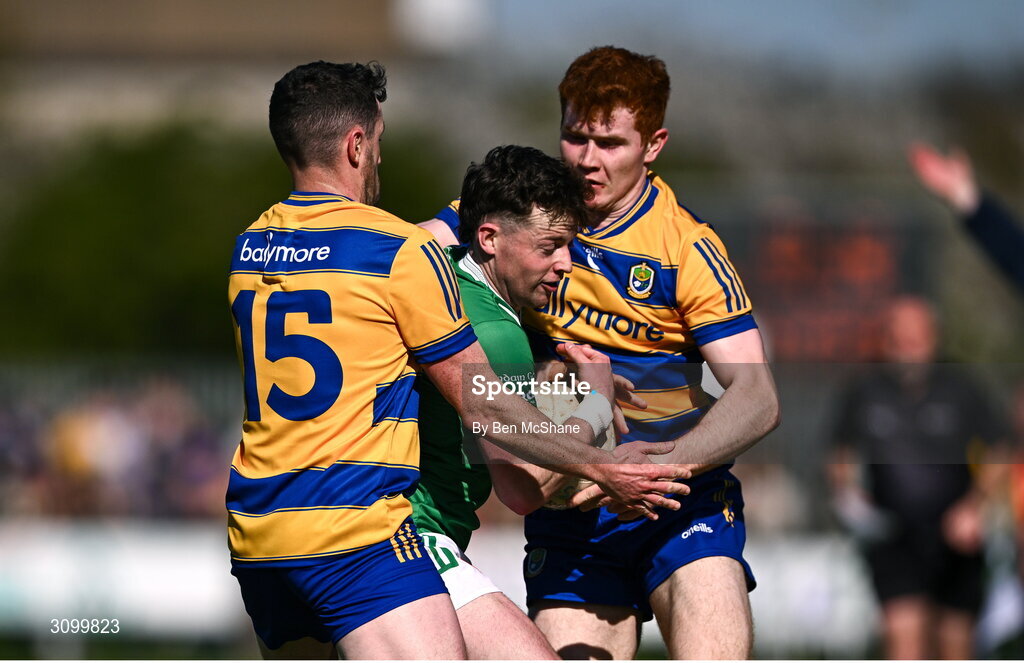5 April 2025; Nathan McElwaine of London is tackled by Ciaráin Murtagh, left, and Colm Neary of Roscommon during the Connacht GAA Football Senior Championship quarter-final match between London and Roscommon at McGovern Park in Ruislip, England. Photo by Ben McShane/Sportsfile