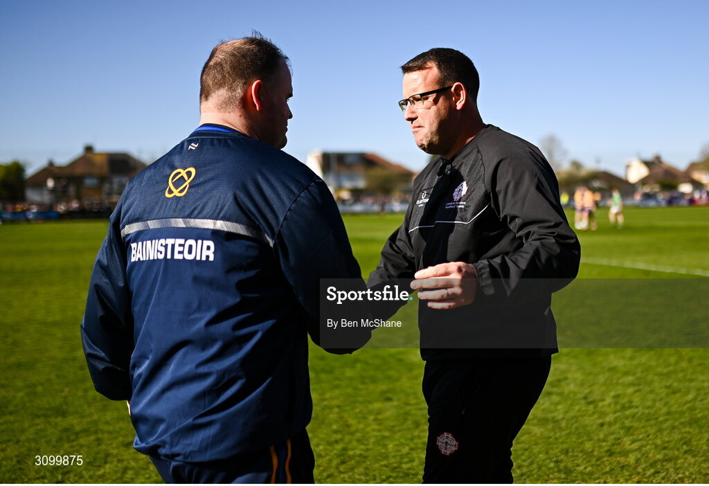 5 April 2025; London manager Michael Maher, right, and Roscommon manager Davy Burke shake hands after the Connacht GAA Football Senior Championship quarter-final match between London and Roscommon at McGovern Park in Ruislip, England. Photo by Ben McShane/Sportsfile
