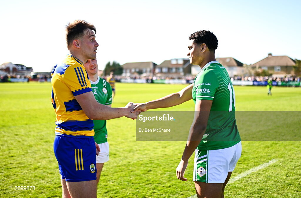 5 April 2025; Enda Smith of Roscommon and Joshua Obahor of London after the Connacht GAA Football Senior Championship quarter-final match between London and Roscommon at McGovern Park in Ruislip, England. Photo by Ben McShane/Sportsfile