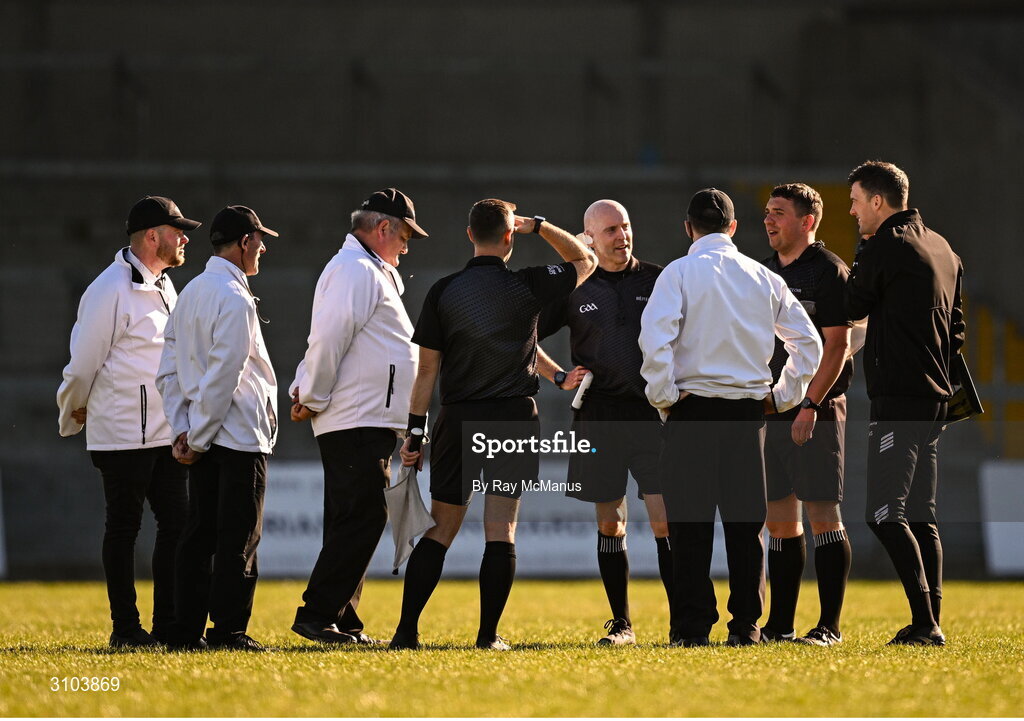6 April 2025; Referee Liam Devenney and his officials await the start of extra time during the Leinster GAA Football Senior Championship round one match between Longford and Wicklow at Glennon Brothers Pearse Park in Longford. Photo by Ray McManus/Sportsfile