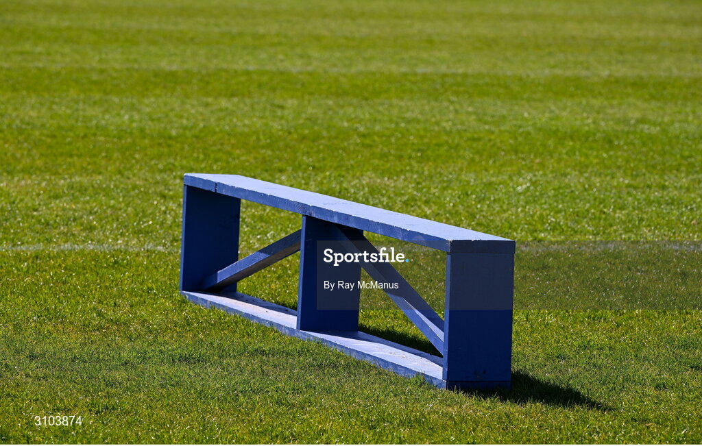6 April 2025; The 'team picture' bench on the pitch before the Leinster GAA Football Senior Championship round one match between Longford and Wicklow at Glennon Brothers Pearse Park in Longford. Photo by Ray McManus/Sportsfile