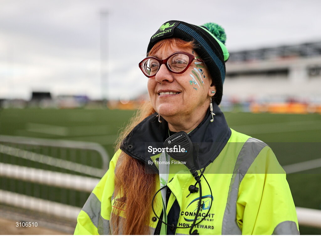 12 April 2025; Supervising steward Therese McIntyre before the EPCR Challenge Cup quarter-final match between Connacht and Racing 92 at Dexcom Stadium in Galway. Photo by Thomas Flinkow/Sportsfile