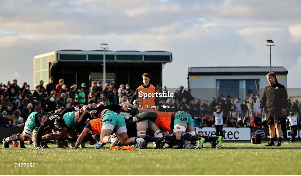 12 April 2025; Connacht scrum and contact coach Colm Tucker watches on as his players warm up before the EPCR Challenge Cup quarter-final match between Connacht and Racing 92 at Dexcom Stadium in Galway. Photo by Thomas Flinkow/Sportsfile
