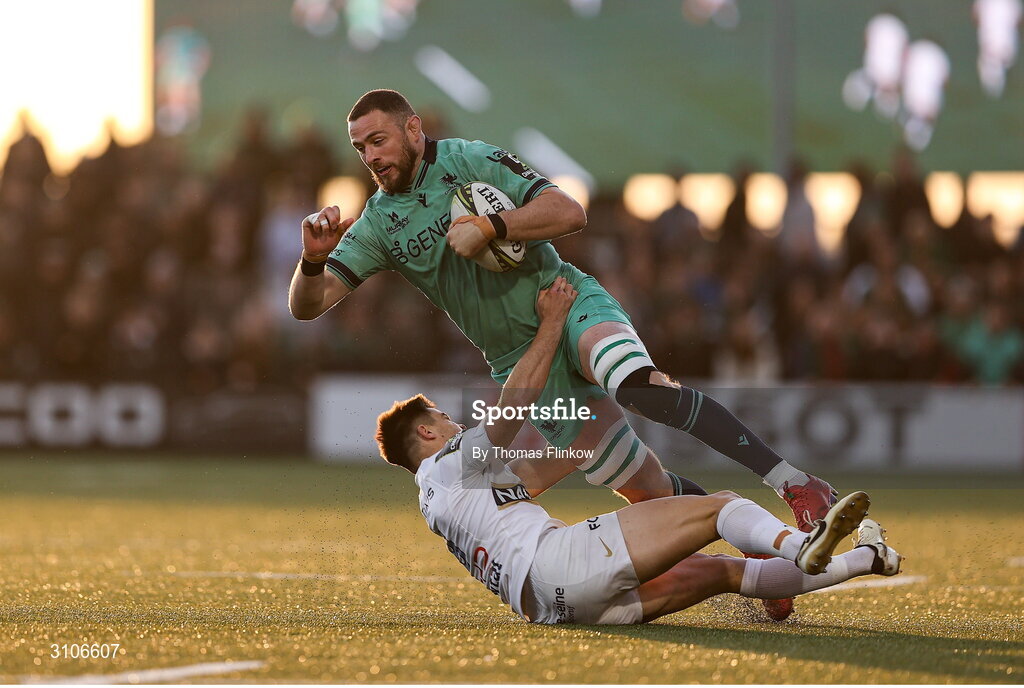 12 April 2025; Josh Murphy of Connacht is tackled by Nolann le Garrec of Racing 92 during the EPCR Challenge Cup quarter-final match between Connacht and Racing 92 at Dexcom Stadium in Galway. Photo by Thomas Flinkow/Sportsfile