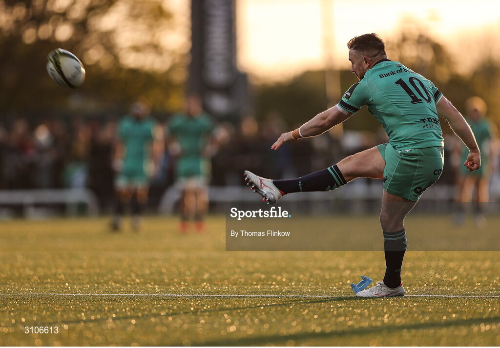 12 April 2025; JJ Hanrahan of Connacht kicks a conversion during the EPCR Challenge Cup quarter-final match between Connacht and Racing 92 at Dexcom Stadium in Galway. Photo by Thomas Flinkow/Sportsfile
