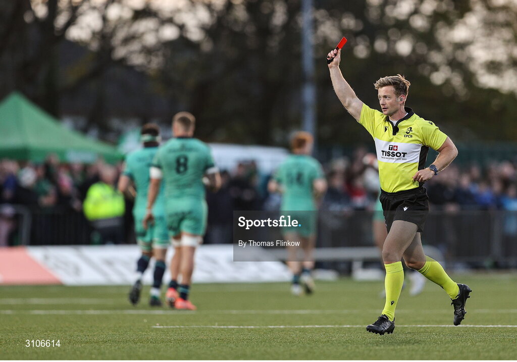 12 April 2025; Referee Christophe Ridley shows a red card to Wame Naituvi of Racing 92, not pictured, during the EPCR Challenge Cup quarter-final match between Connacht and Racing 92 at Dexcom Stadium in Galway. Photo by Thomas Flinkow/Sportsfile