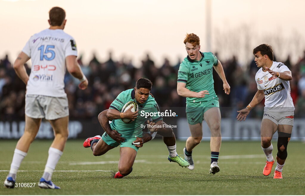 12 April 2025; Josh Ioane of Connacht is tackled by Vinaya Habosi of Racing 92 during the EPCR Challenge Cup quarter-final match between Connacht and Racing 92 at Dexcom Stadium in Galway. Photo by Thomas Flinkow/Sportsfile