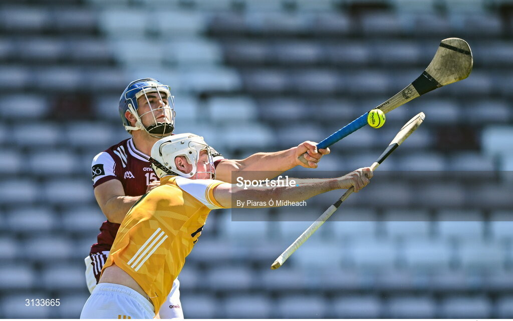 17 May 2025; Anthony Burns of Galway in action against Paddy Burke of Antrim during the Leinster GAA Hurling Senior Championship Round 4 match between Galway and Antrim at Pearse Stadium in Galway. Photo by Piaras Ó Mídheach/Sportsfile
