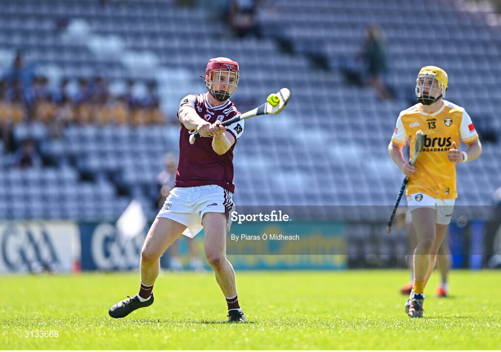 17 May 2025; Tom Monaghan of Galway shoots as Cormac McKeown of Antrim closes in during the Leinster GAA Hurling Senior Championship Round 4 match between Galway and Antrim at Pearse Stadium in Galway. Photo by Piaras Ó Mídheach/Sportsfile