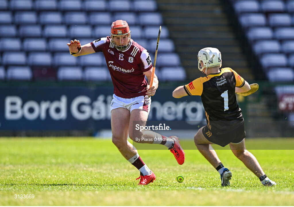 17 May 2025; Conor Whelan of Galway in action against Antrim goalkeeper Ryan Elliott during the Leinster GAA Hurling Senior Championship Round 4 match between Galway and Antrim at Pearse Stadium in Galway. Photo by Piaras Ó Mídheach/Sportsfile