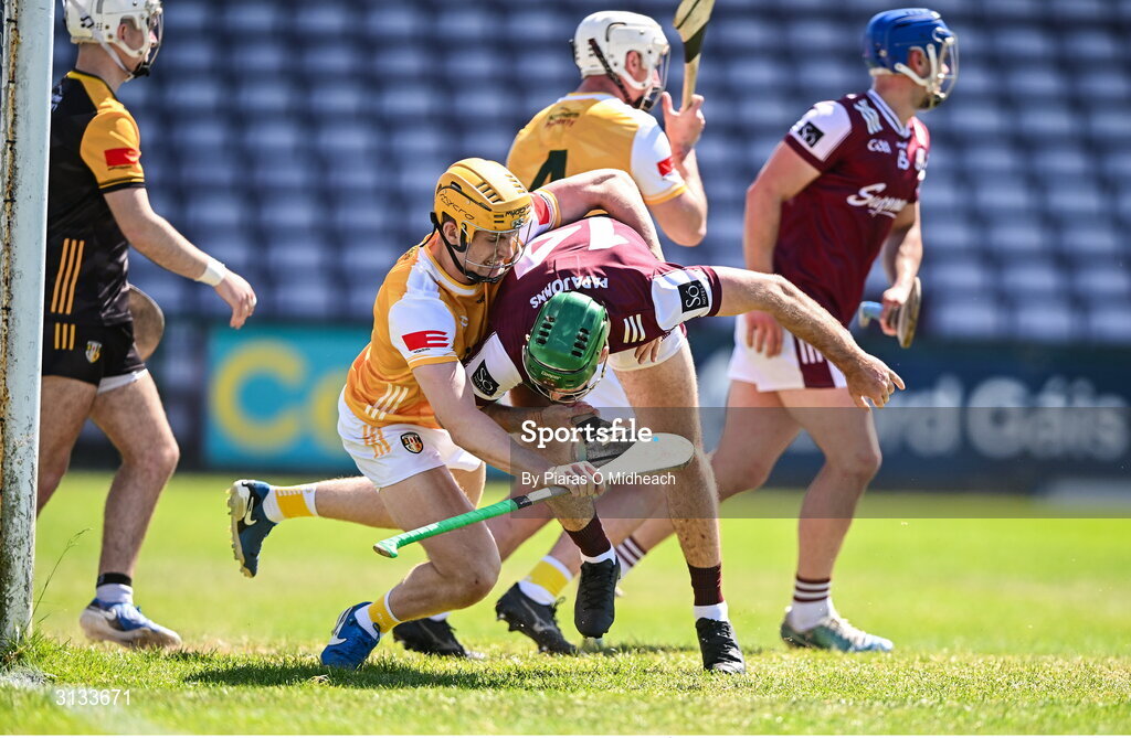 17 May 2025; Niall O’Connor of Antrim and Brian Concannon of Galway tussle off the ball during the Leinster GAA Hurling Senior Championship Round 4 match between Galway and Antrim at Pearse Stadium in Galway. Photo by Piaras Ó Mídheach/Sportsfile
