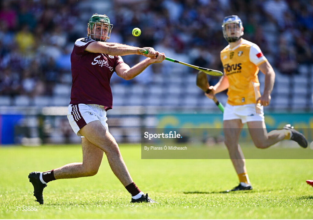 17 May 2025; Brian Concannon of Galway scores his side's first goal during the Leinster GAA Hurling Senior Championship Round 4 match between Galway and Antrim at Pearse Stadium in Galway. Photo by Piaras Ó Mídheach/Sportsfile