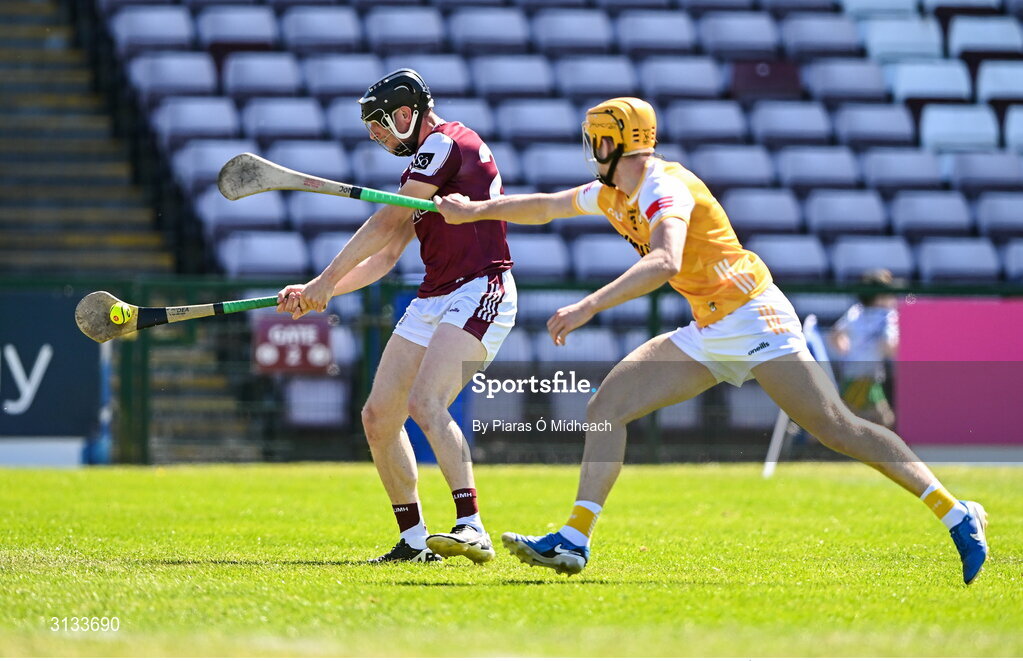 17 May 2025; Kevin Cooney of Galway in action against Niall O’Connor of Antrim during the Leinster GAA Hurling Senior Championship Round 4 match between Galway and Antrim at Pearse Stadium in Galway. Photo by Piaras Ó Mídheach/Sportsfile