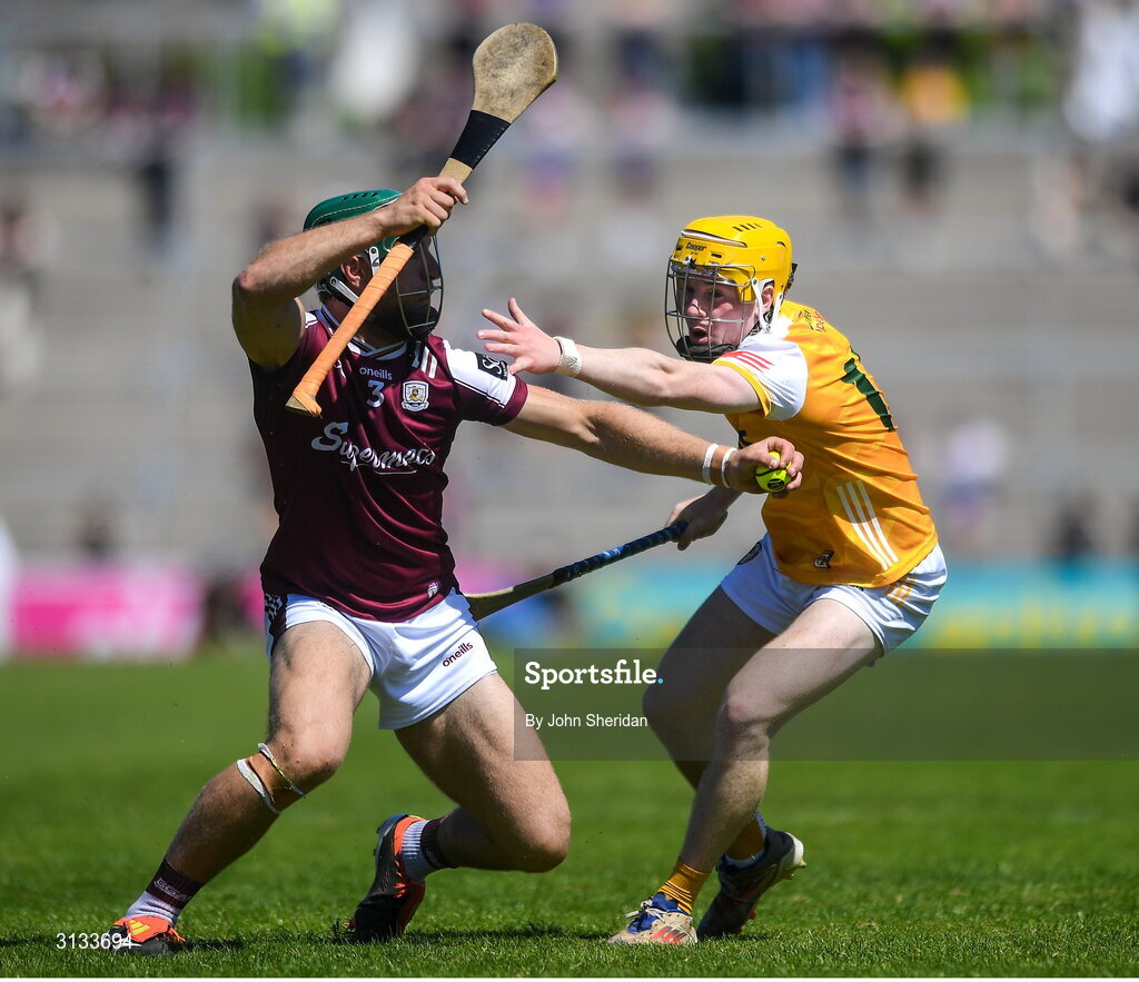 17 May 2025; Fintan Burke of Galway in action against Cormac McKeown of Antrim during the Leinster GAA Hurling Senior Championship Round 4 match between Galway and Antrim at Pearse Stadium in Galway. Photo by John Sheridan/Sportsfile