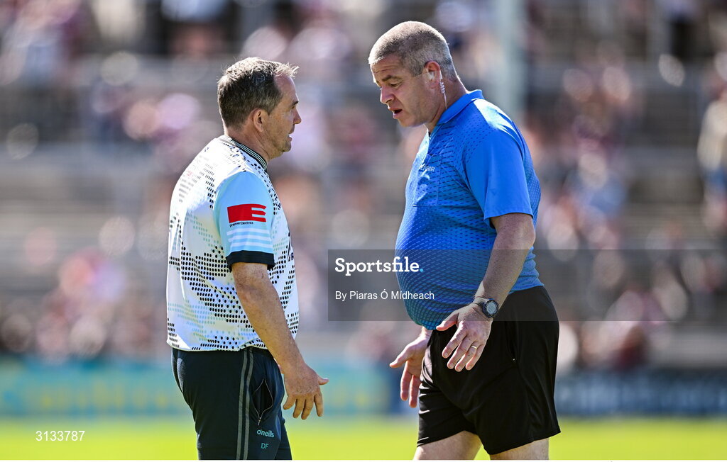 17 May 2025; Antrim manager Davy Fitzgerald in conversation with sideline official Peter Carroll before Fitzgerald was shown the yellow card by Thomas Gleeson during the Leinster GAA Hurling Senior Championship Round 4 match between Galway and Antrim at Pearse Stadium in Galway. Photo by Piaras Ó Mídheach/Sportsfile