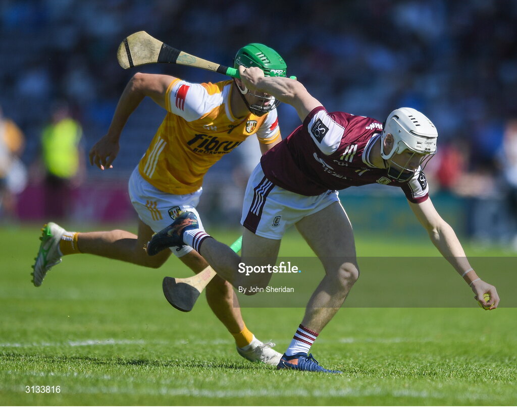 17 May 2025; Cathal Mannion of Galway in action against Conall Bohill of Antrim during the Leinster GAA Hurling Senior Championship Round 4 match between Galway and Antrim at Pearse Stadium in Galway. Photo by John Sheridan/Sportsfile