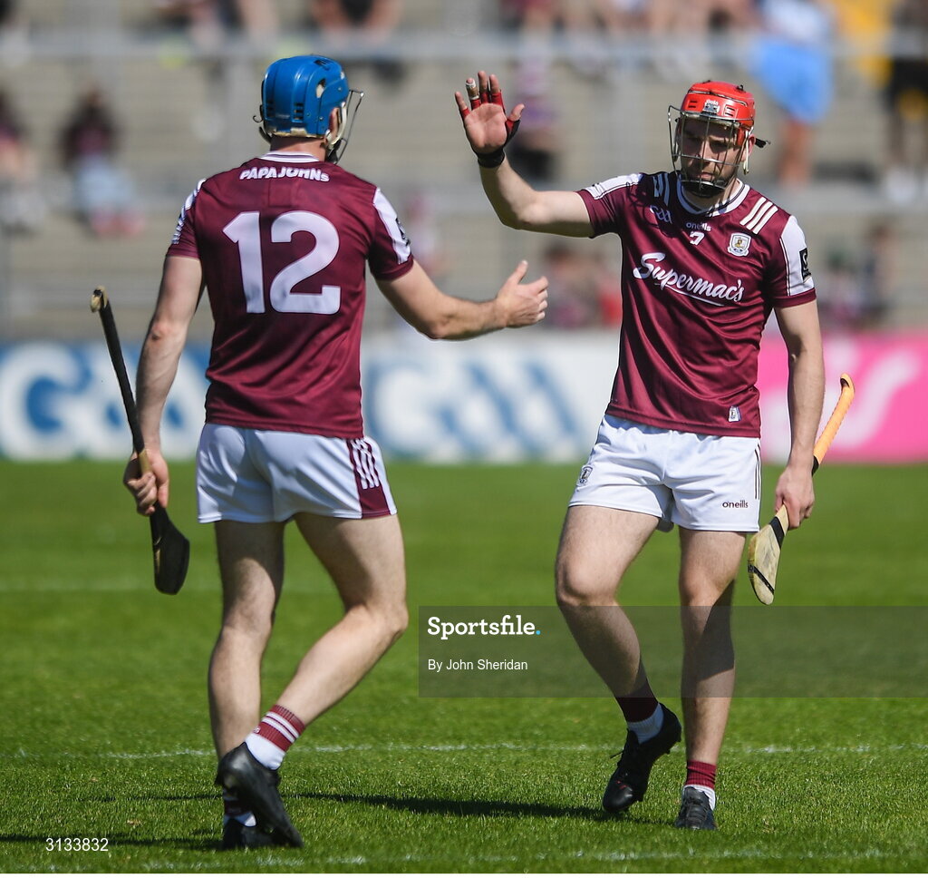 17 May 2025; Galway players, from left, Conor Cooney and TJ Brennan after the Leinster GAA Hurling Senior Championship Round 4 match between Galway and Antrim at Pearse Stadium in Galway. Photo by John Sheridan/Sportsfile