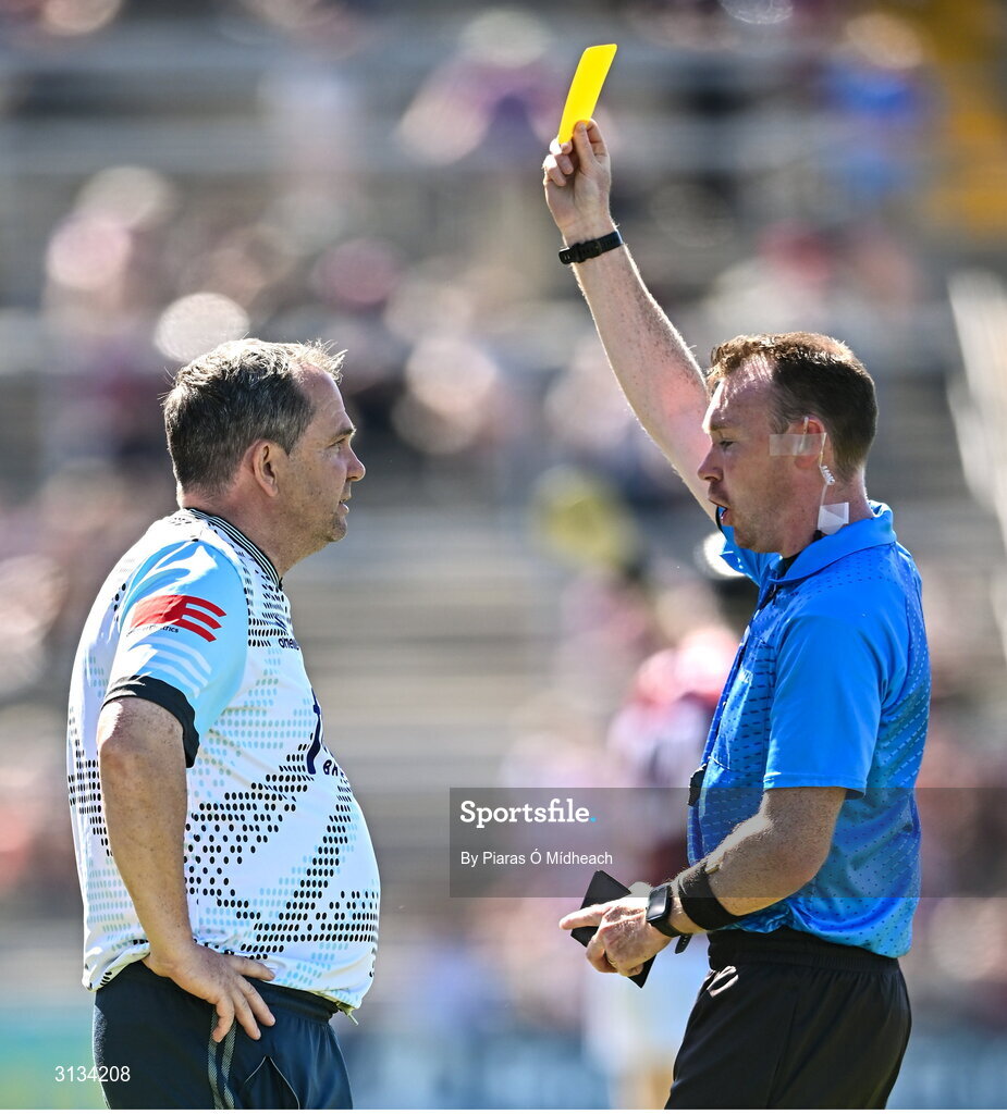 17 May 2025; Antrim manager Davy Fitzgerald is shown the yellow card by referee Thomas Gleeson during the Leinster GAA Hurling Senior Championship Round 4 match between Galway and Antrim at Pearse Stadium in Galway. Photo by Piaras Ó Mídheach/Sportsfile