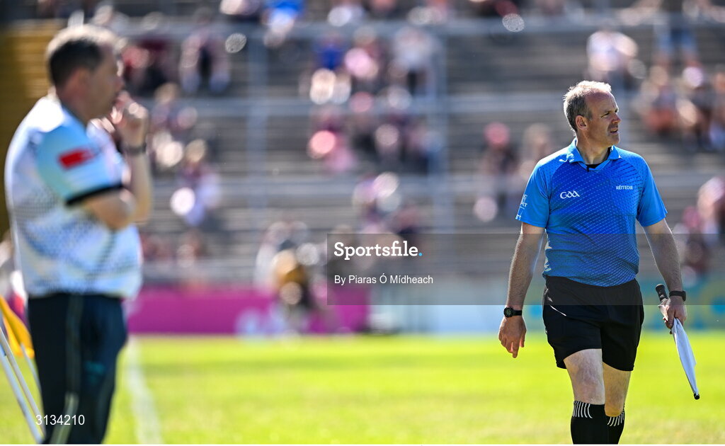 17 May 2025; Linesman Johnny Murphy and Antrim manager Davy Fitzgerald look on during the Leinster GAA Hurling Senior Championship Round 4 match between Galway and Antrim at Pearse Stadium in Galway. Photo by Piaras Ó Mídheach/Sportsfile