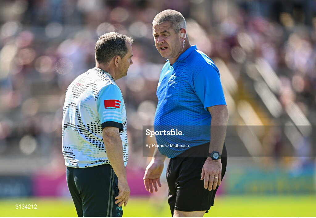17 May 2025; Antrim manager Davy Fitzgerald in conversation with sideline official Peter Carroll before Fitzgerald was shown the yellow card by Thomas Gleeson during the Leinster GAA Hurling Senior Championship Round 4 match between Galway and Antrim at Pearse Stadium in Galway. Photo by Piaras Ó Mídheach/Sportsfile