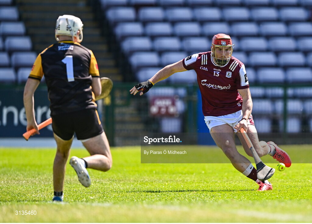 17 May 2025; Conor Whelan of Galway in action against Antrim goalkeeper Ryan Elliott during the Leinster GAA Hurling Senior Championship Round 4 match between Galway and Antrim at Pearse Stadium in Galway. Photo by Piaras Ó Mídheach/Sportsfile