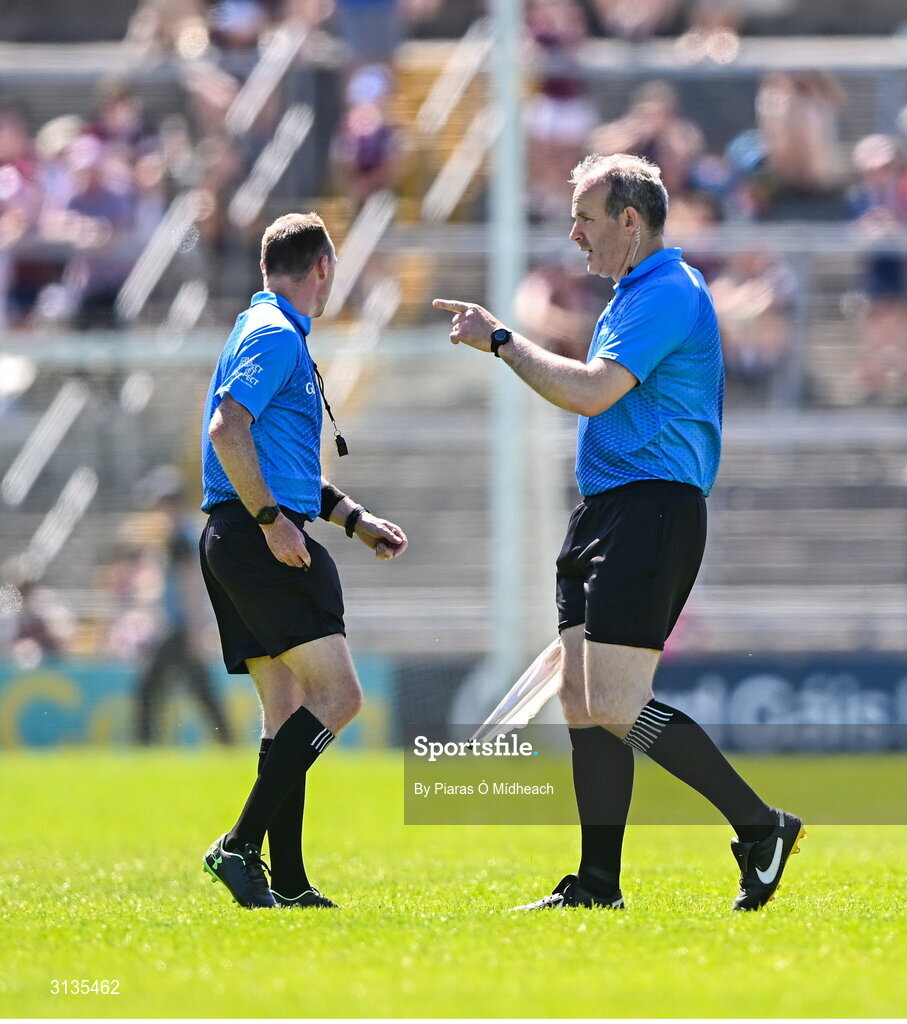 17 May 2025; Referee Thomas Gleeson, left, and linesman Johnny Murphy in discussion before Declan McCloskey of Antrim was sent off during the Leinster GAA Hurling Senior Championship Round 4 match between Galway and Antrim at Pearse Stadium in Galway. Photo by Piaras Ó Mídheach/Sportsfile