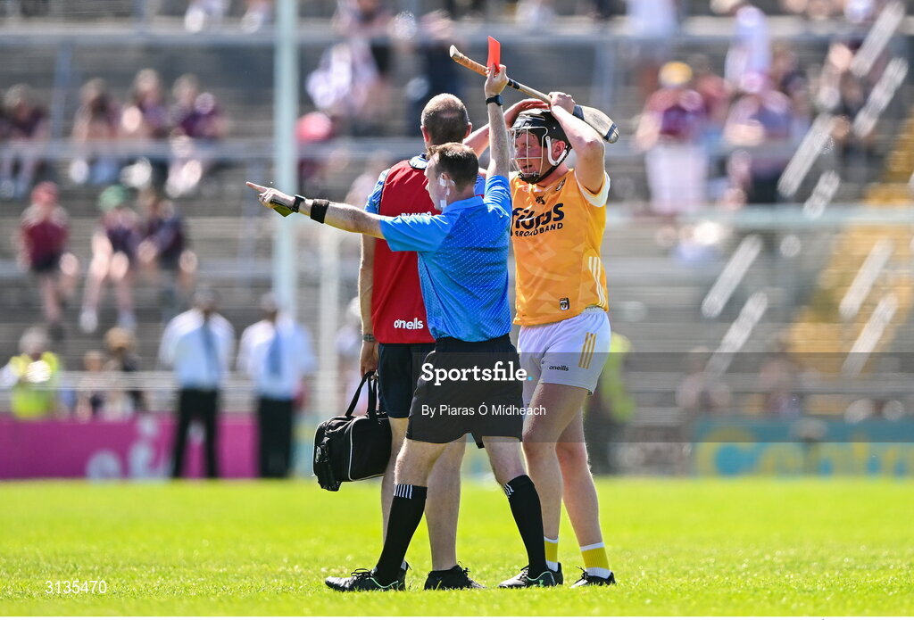 17 May 2025; Declan McCloskey of Antrim is shown the red card by Thomas Gleeson during the Leinster GAA Hurling Senior Championship Round 4 match between Galway and Antrim at Pearse Stadium in Galway. Photo by Piaras Ó Mídheach/Sportsfile
