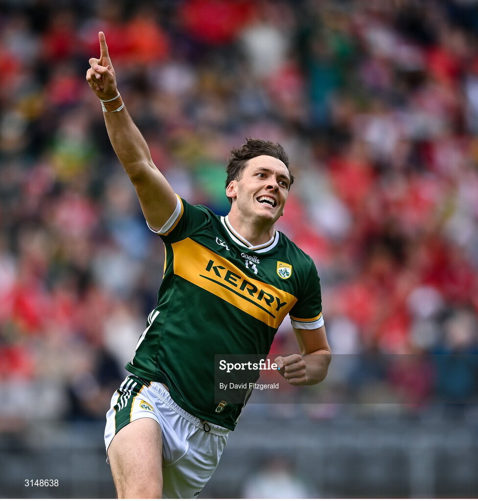 31 May 2025; David Clifford of Kerry celebrates after scoring his side's first goal during the GAA Football All-Ireland Senior Championship Round 2 match between Cork and Kerry at SuperValu Páirc Uí Chaoimh in Cork. Photo by David Fitzgerald/Sportsfile