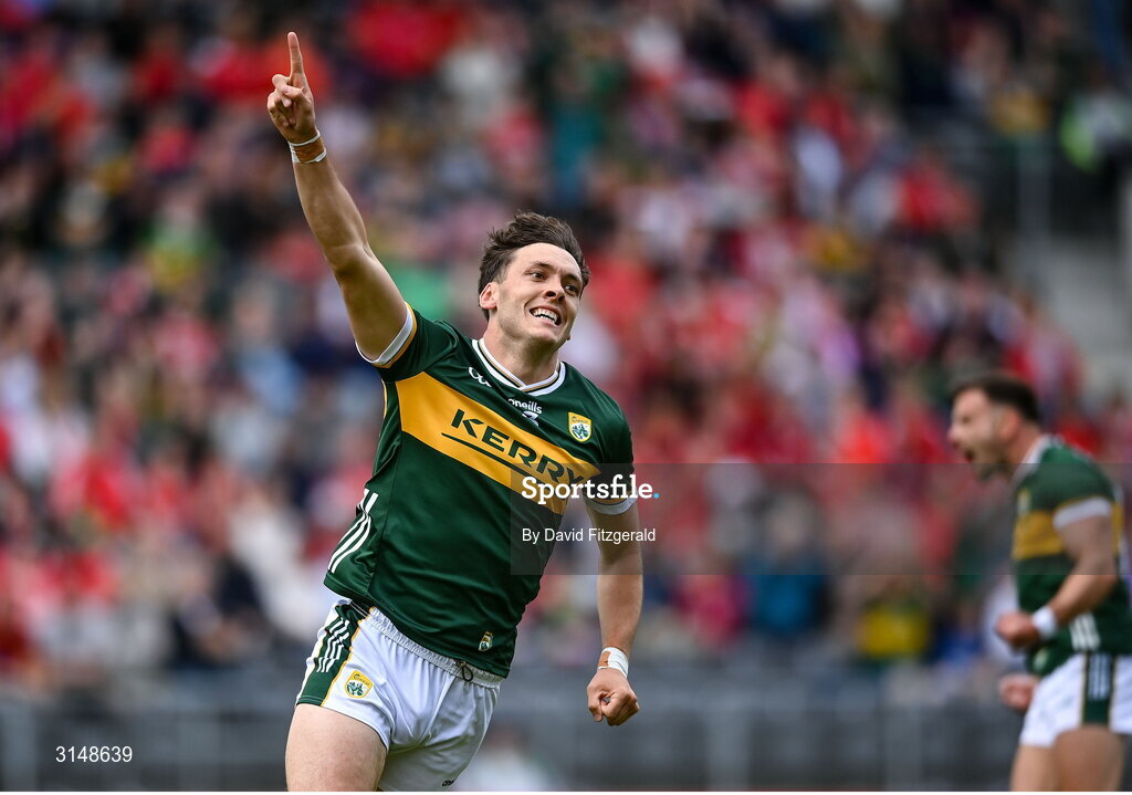 31 May 2025; David Clifford of Kerry celebrates after scoring his side's first goal during the GAA Football All-Ireland Senior Championship Round 2 match between Cork and Kerry at SuperValu Páirc Uí Chaoimh in Cork. Photo by David Fitzgerald/Sportsfile