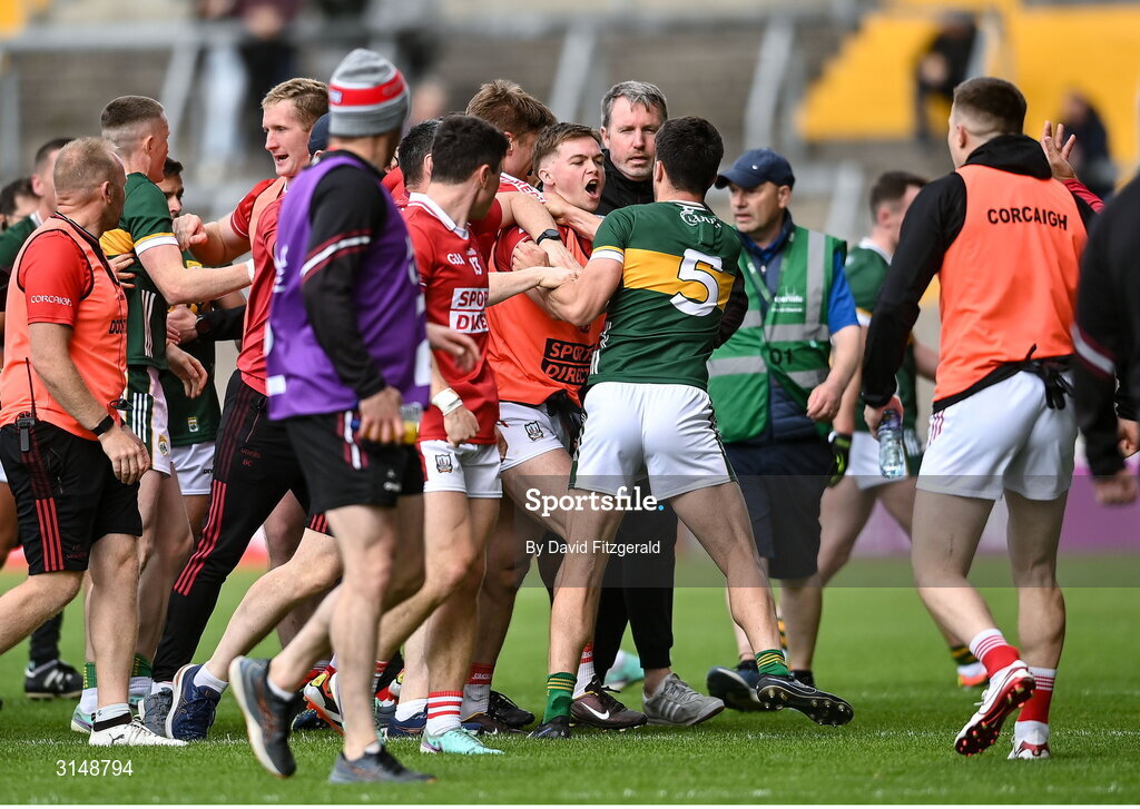 31 May 2025; Players from both sides tussle at half time during the GAA Football All-Ireland Senior Championship Round 2 match between Cork and Kerry at SuperValu Páirc Uí Chaoimh in Cork. Photo by David Fitzgerald/Sportsfile
