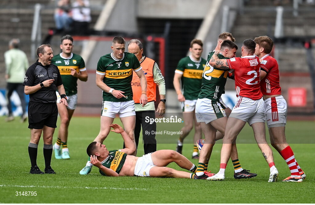 31 May 2025; Players from both sides tussle at half time during the GAA Football All-Ireland Senior Championship Round 2 match between Cork and Kerry at SuperValu Páirc Uí Chaoimh in Cork. Photo by David Fitzgerald/Sportsfile