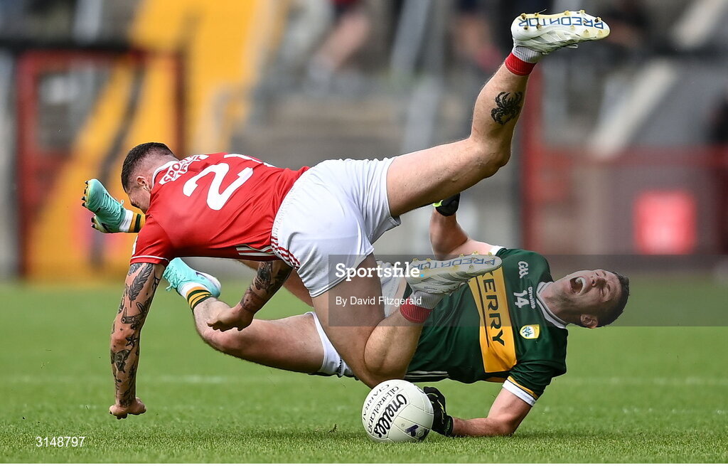 31 May 2025; Paul Geaney of Kerry in action against Seán Walsh of Cork during the GAA Football All-Ireland Senior Championship Round 2 match between Cork and Kerry at SuperValu Páirc Uí Chaoimh in Cork. Photo by David Fitzgerald/Sportsfile