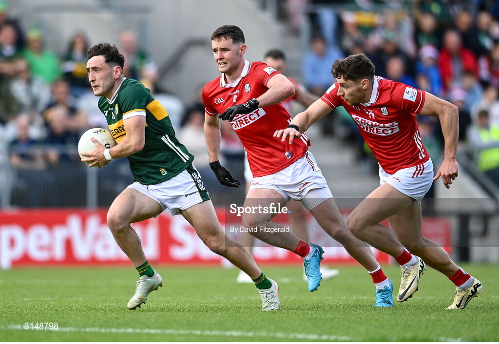 31 May 2025; Paudie Clifford of Kerry in action against Paul Walsh of Cork during the GAA Football All-Ireland Senior Championship Round 2 match between Cork and Kerry at SuperValu Páirc Uí Chaoimh in Cork. Photo by David Fitzgerald/Sportsfile
