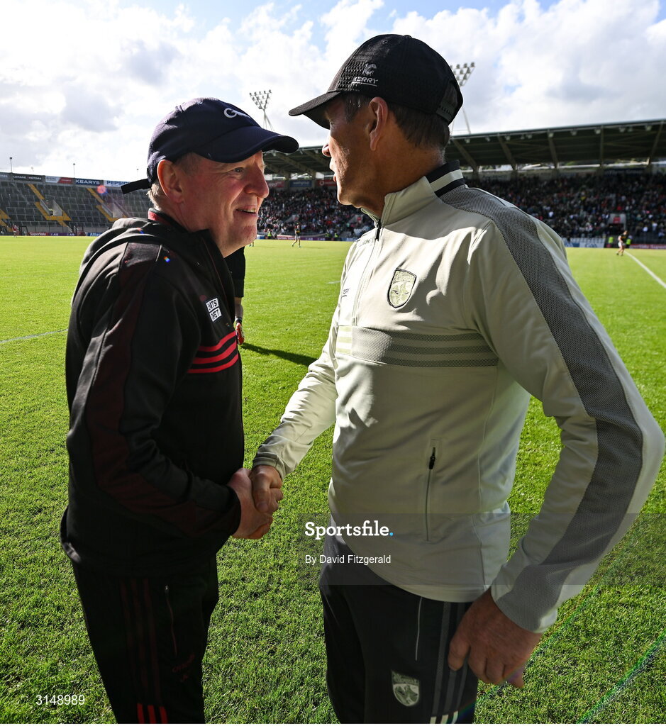 31 May 2025; Kerry manager Jack O'Connor and Cork manager John Cleary after the GAA Football All-Ireland Senior Championship Round 2 match between Cork and Kerry at SuperValu Páirc Uí Chaoimh in Cork. Photo by David Fitzgerald/Sportsfile