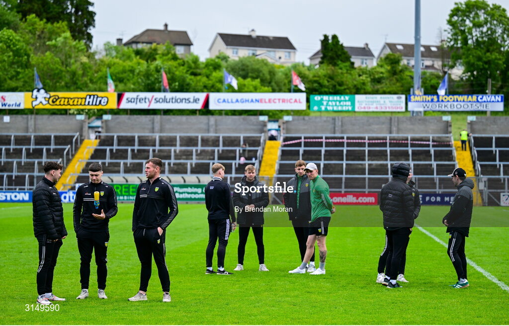 1 June 2025; Donegfal players walk the pitch before the GAA Football All-Ireland Senior Championship Round 2 match between Cavan and Donegal at Kingspan Breffni in Cavan. Photo by Brendan Moran/Sportsfile