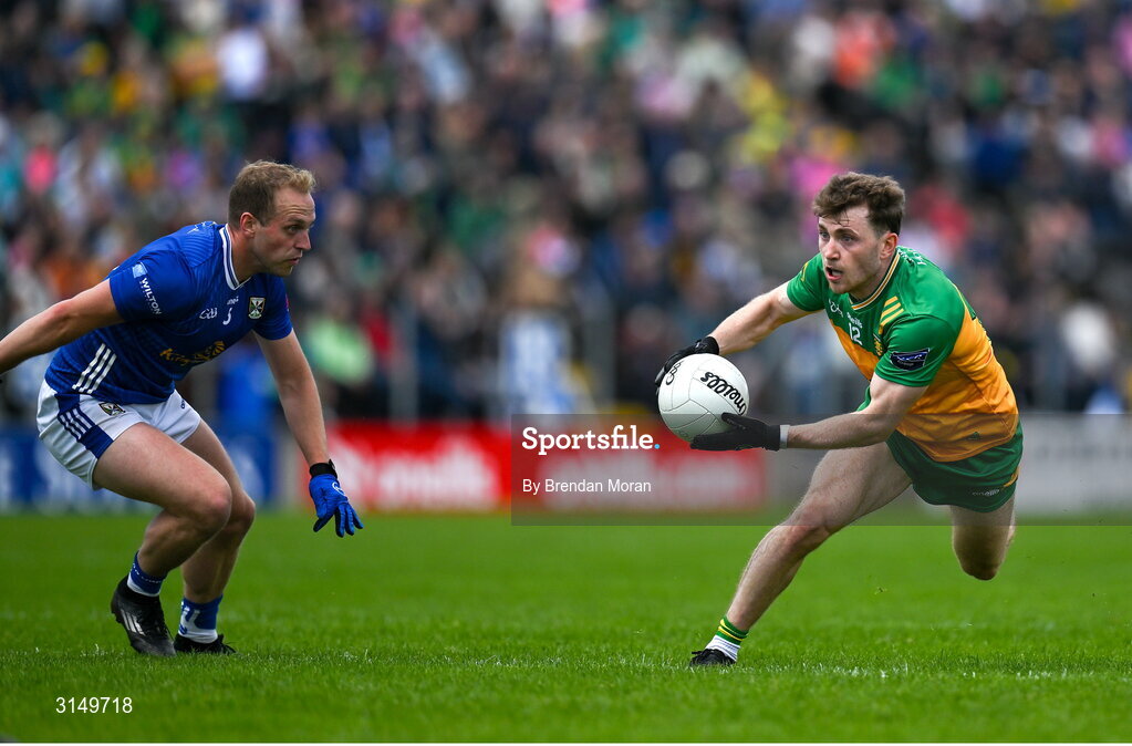 1 June 2025; Shane O'Donnell of Donegal in action against Padraig Faulkner of Cavan during the GAA Football All-Ireland Senior Championship Round 2 match between Cavan and Donegal at Kingspan Breffni in Cavan. Photo by Brendan Moran/Sportsfile